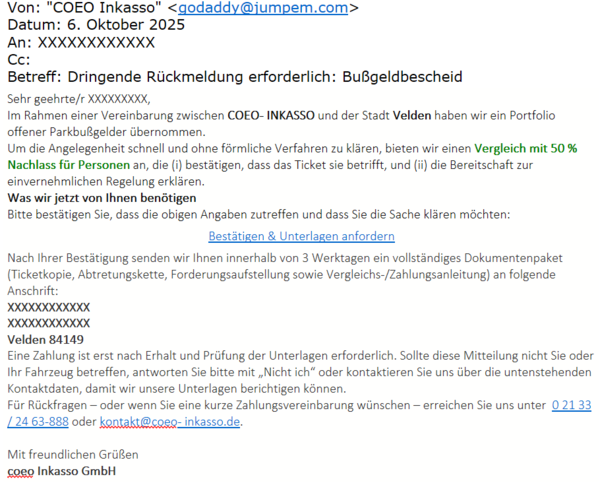 In Velden tauchen vermehrt Betrugsmails auf.Diese stammen von angeblichen Inkasso-Büros auf und verweisen auf offene Parkbußgelder in Velden.Es wird empfohlen, auf derartige Mails nicht zu reagieren und keine Links in den Mails zu öffnen.